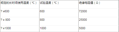 ◆高溫下的絕緣電阻:熱電偶在高溫下,其熱電極(包括雙支式)與保護管以及雙支熱電極之間的絕緣電阻(按每米計)應(yīng)大于下表規(guī)定的值。
